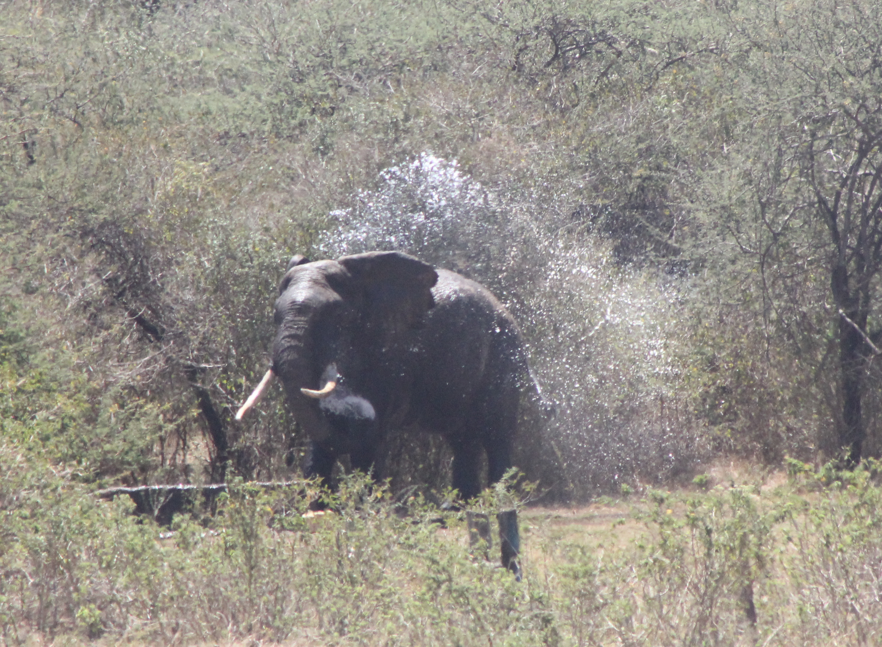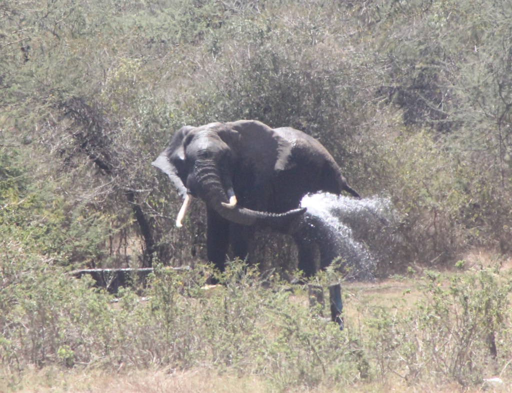 All of this has been going on with the resident elephant in the background. He is destroying fences on a nightly basis, though fortunately the cows are now so used to him they no longer run away and cause extra nighttime havoc. The elephant is also drinking copious amounts of scarce water, and just to show off, throwing a lot more water around as he bathes.